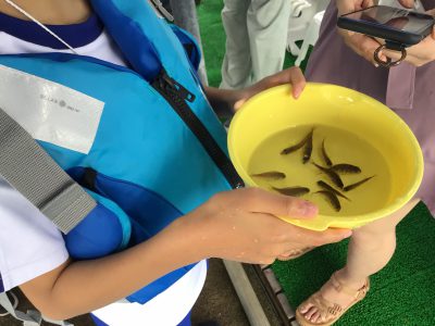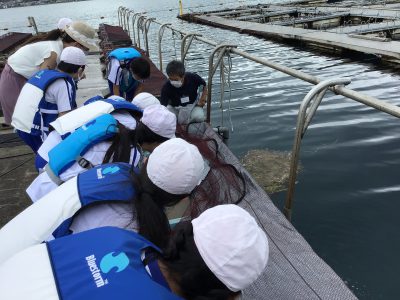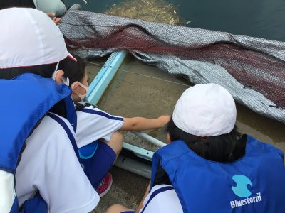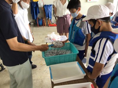 次に「トリガイ」の養殖の様子を観察して、マダイの稚魚の放流を体験しました。
