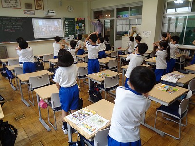 子どもたちの表情や動きを見ていると、楽しくなってきます。パプリカダンスを踊りながら、英語に親しむ2年生の様子です。