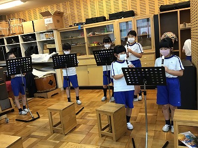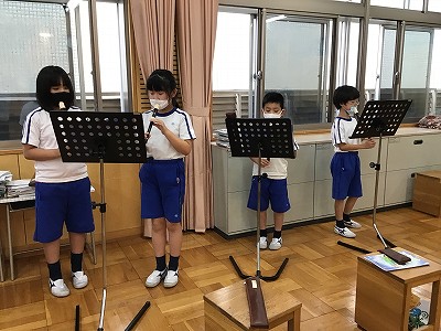 今日は、「♪笛星人」の伴奏に合わせて「シ」のリズムを確かめる学習です。譜面台に曲集を立て、個人練習をしています。スピードが上がる後半まで、伴奏に引きずられることなく、リズムと「シ」の指使いの構えは、ばっちりです!