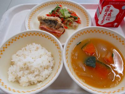 今日の献立は、さばの竜田揚げ、キャベツのごまあえ、かぼちゃのみそ汁」です。