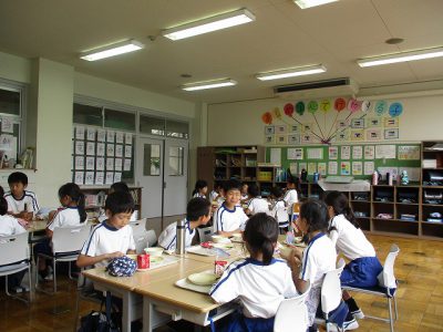 給食では、れんげ5班、19班、25班が、2年生教室に来ています。