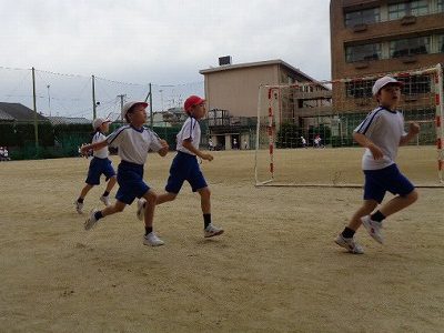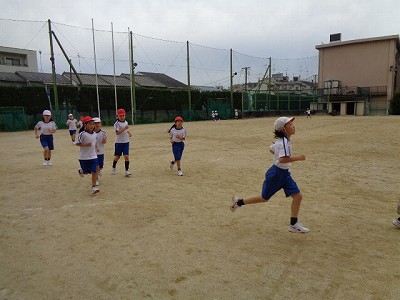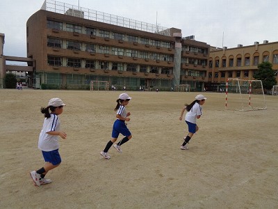 小学校運動場で準備体操を行った後、4年生といっしょに走りました。