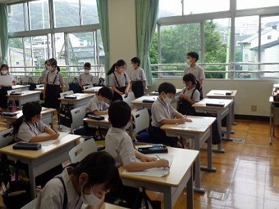 審判の判断の時・・・しーんとした時間が流れ、結果が判明。結果は、3対3の引き分けで、いろいろな声が入り交じっての歓声が教室にひびきました。