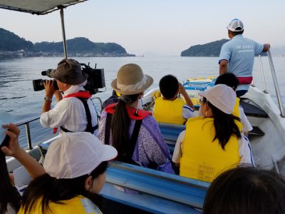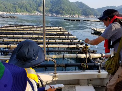 ここからは2班に分かれて、ブリ等を養殖している「海上いけす」、岩ガキを養殖している「海上いかだ」での見学です。