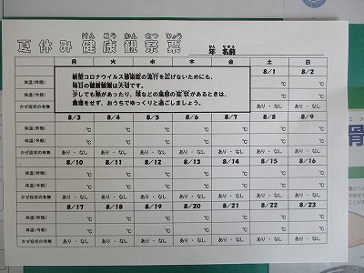 自分の健康観察をすることは、周りでのコロナの流行を防ぐことにもつながります。2学期を安心して始められるためにも、ご理解ご協力をお願いいたします。