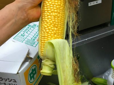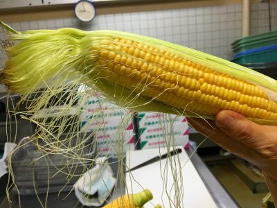 とうもろこしごはんは、調理員さんが皮やひげをきれいにとってできました。