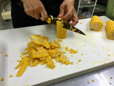 実のつまった立派なとうもろこしは、包丁で実をそいでいきます。