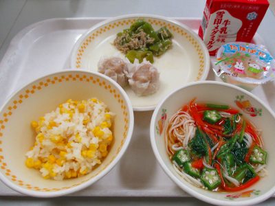 今日の献立は「とうもろこしごはん、肉しゅうまい、万願寺あまとうの炒めもの、七夕そうめん、七夕ゼリー」の七夕献立です。