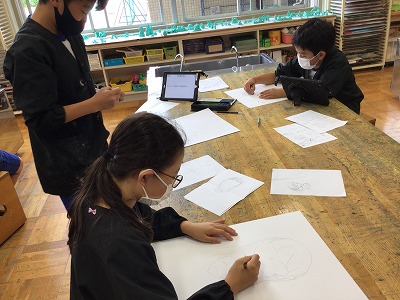 美術館で観たプロの色使いや文字の使い方を参考にして、机の上には展覧会を観てのメモやアイディアを出しあった時のメモを広げて作業しています。