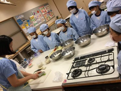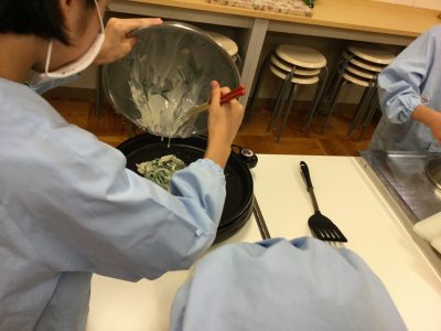 “チヂミのたね”が出来上がりました。ごま油を敷いたプレートに流し込む瞬間です。 このときの腕前こそ、鮮やか~~~! 香ばしい香りが、家庭科室に広がります。