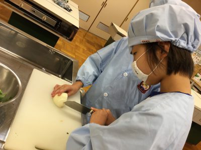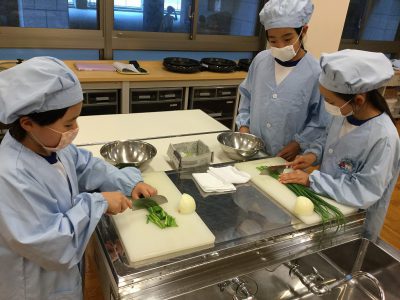 野菜を切る腕前鮮やかに!? 6年生が見守ってくれています。