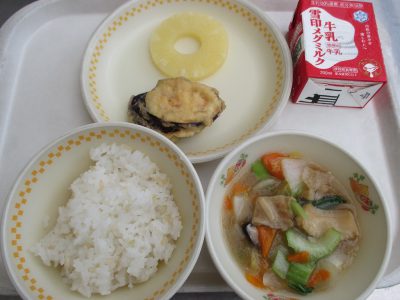 今日の献立は「八宝菜、なすの天ぷら、パイナップル」でした。