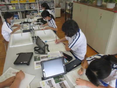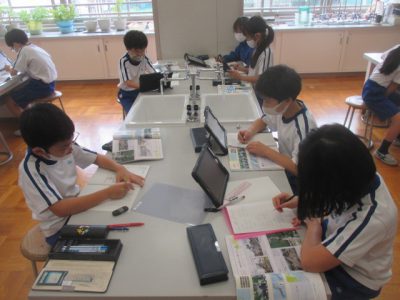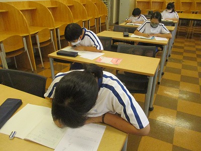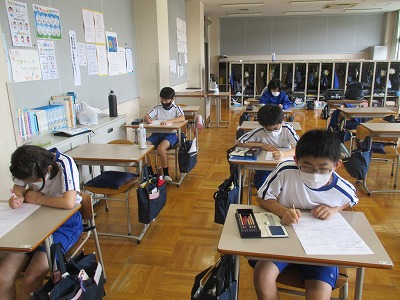 また、少し苦手としている単位の換算の問題も。分からない人は、新小学問題集に載っている単位表を見て、解答している5年生も見られました。