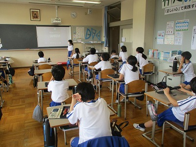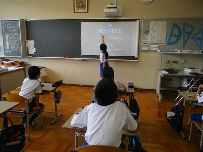 今日は3人の5年生がスクリーンに映る資料を見て、みんなが暮らしやすくするための工夫を発表しました。