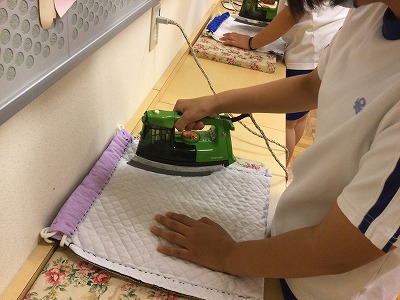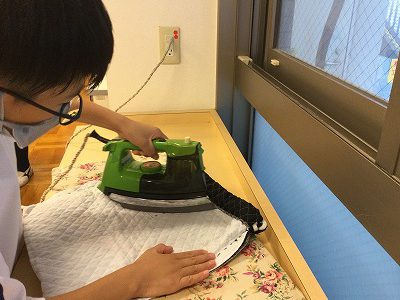 やけどに注意しておそるおそる掛けていきます。表に付ける?裏に付ける?と相談しながらアイロン台に向かいます。