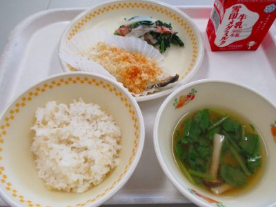 今日の献立は「さわらのパン粉焼き、大根のおかかあえ、壬生菜のみそ汁」です。