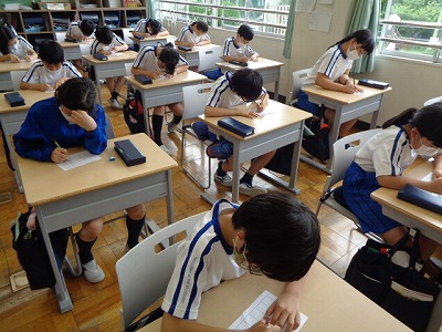 読書の時間は、読み聞かせ係さんが1学期最後の読み聞かせをしてくれました。英語係と協力し、「もったいないばあさん」の絵本を英語と日本語で交互に読み上げてくれます。クラスのみんなからは「今までもったいないと思った事がなかった事も、実はもったいないという事が分かった」「私も、もったいないばあさんのような知恵で資源をむだにしないようにしたい」などの感想が上がっていました。