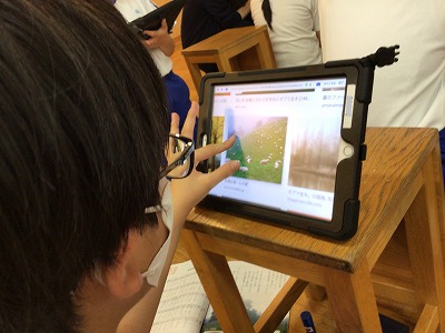 タブレットの検索システムを活用し、「ポプラ並木」や「朝霧」など、どんな様子なのかを調べています。