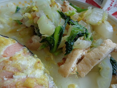 小松菜と白菜のおかかあえです。おかかあえの野菜が食べやすいように、調理過程には小さなポイントがいくつもあります。白菜は少し細めの短冊切り、小松菜は長めに加熱しています。油揚げは野菜と一緒に食べておいしいように、先に味つけしておきます。おいしく食べてもらうには?と考えた工夫がたくさん詰まっています。
