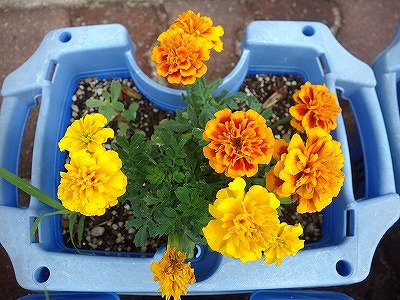 中高グランドに移動するときに「一人一鉢」で育てているマリーゴールドを観察します。種を植え、咲き始めたことはまだまだ小さかったのですが、この時期になるとずいぶん大きくなった株も増えてきました。