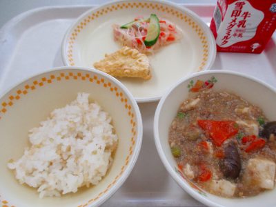 今日の献立は「マーボー豆腐、はるさめサラダ、さつまいもの天ぷら」です。