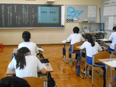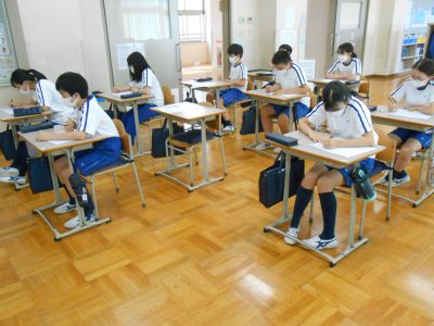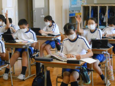 夏の二十四節気を確認した後、夏に関する句について学習しました。その後、夏の季語を使って俳句づくりを行いました。「アイス」や「せみ」と、夏らしい季語がたくさん登場します。今日は、「かな・けり・や」などの「切れ字」という言葉についても学習しました。切れ字を俳句に取り入れようと、挑戦している6年生もいました。