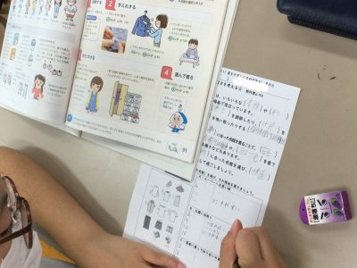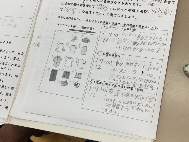 もう一つの活動は、“衣服の着方”を考える学習です。「保健衛生面」と「生活活動面」等、目的によって着方が変化することを改めて気づくことから、学習は始まりました。