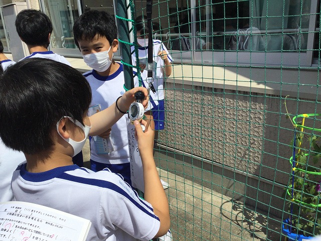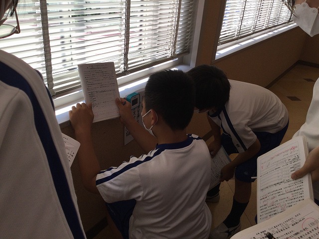 時間割を変更して、「夏を涼しくさわやかに」の続きを学習しました。住まい方にも着方にも関わる“気温(室温)と湿度”調べからスタートです。 「熱中症警戒アラート」が発令される予想の京都です。室内二カ所とグラウンドの日なた・日かげを比較するため、測定場所に向かいました。