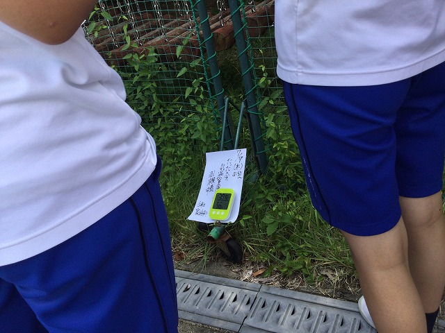 なんと午前9時45分の時点で、日なたは37℃に達していました。湿度は34%とからっとしていましたが、ゴムの地面を触ると「あつっ!」の状態です。 また、ビオトープ前にはま日かげが残っている時間帯。調べてみると、31.2℃、湿度51%でした。さらに、ゴム面の他コンクリート面を触ると、冷たいまではいきませんが「ひんやり」した感じを受けたようです。