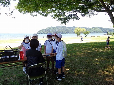 浜辺で少し散策。湖水と島に感激の様子。「みんなで大ジャ~ンプ!」