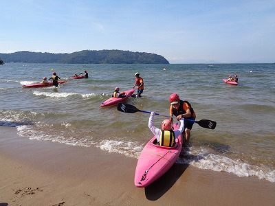 一列に並びます。実は風があり、波が立っていました。浜辺を出発しても、しっかりとパドルを動かさないと浜辺に戻されてしまいそうです。