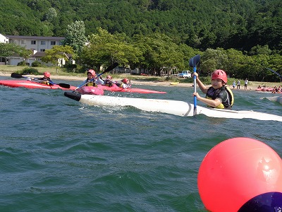 写真の右下がブイです。みんなが、これを目指しました。パドルとカヌーをコントロールしようとしますが、波がみんなの行く手を阻みます。みんな真剣です!
