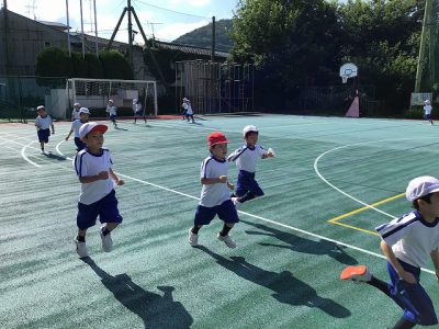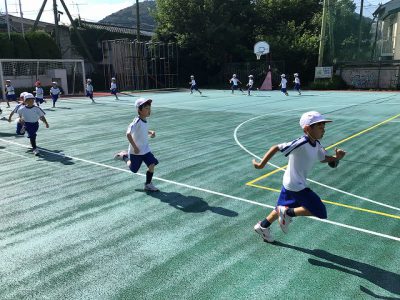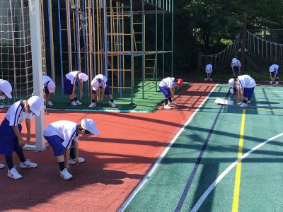 日が昇ってくるにつれて、暑さが増す今朝の運動場。 準備体操は、日陰で進めました。
