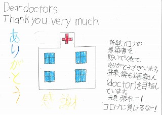 「新型コロナの感染者を防いでくれて、ありがとうございます。将来僕もお医者さん(doctor)を目指しています。頑張れー!コロナに負けるなー!」「ありがとう!感謝!」