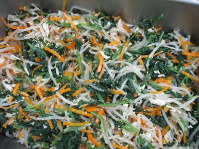 ほうれん草、人参、もやしのナムルです。3色の色合いでシャキシャキのナムルでした。緑黄色野菜のほうれん草、人参でカロテンたっぷりの和え物でした。