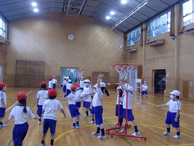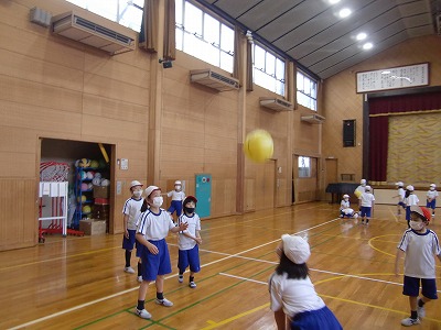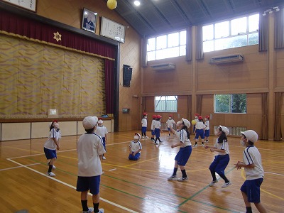 「元・大・中・小」・ワンゴールバスケット・ソフトバレーボールのボール遊び3種目を行いました。