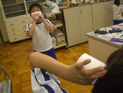3人や4人で1つの糸電話を作って、声が届くかどうかも実験しました。