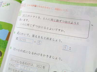 「同じ数ずつ・・・」「一人に○こずつ・・・」などの言葉を使って、かけ算やわり算の問題を仕立てていました。