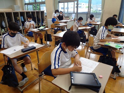 波が印象的な日本海、まぶしいほどの青い空と海の色…と思い思いの“海”を見つけ、選んだ訳や、海への想いをロイロノートに書き込んでいます。