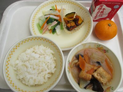 今日の献立は「厚揚げのみそ炒め、おひたし、かぼちゃのグリル、冷凍みかん」でした。