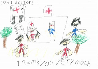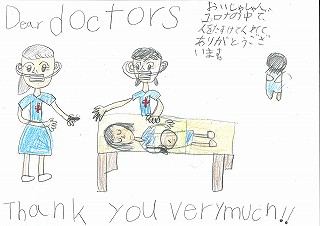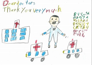 「おいしゃさん、コロナの中で人をたすけてくれて ありがとうございます。」