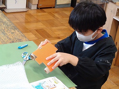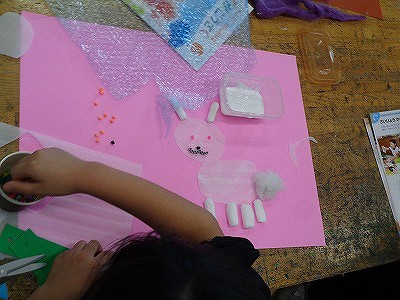 ここでは,緩衝材や毛糸,布などの形や色,手触りなどから思いついたものを絵に表す学習です。つまり,はじめにうさぎや電車など表したいものを考え,それに合った材料をあてはめてつくりすすめるのではなく,多様な材料を見たり触ったりしているうちに「これにしよう!」という流れになります。
