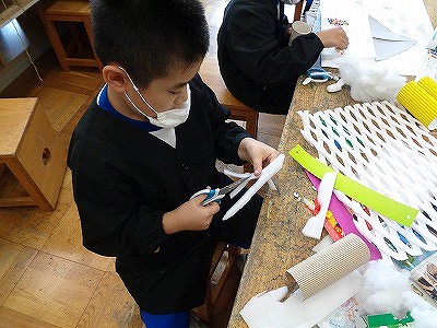 自分で準備した材料を生かして思いつく児童も,学校で準備した材料で「思いついた!」とつぶやく児童も,それぞれさっそく自分で選んだ画用紙に貼ったり描き加えたりして発展させながら表していくことができました。