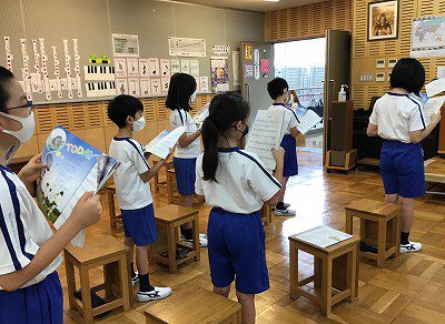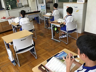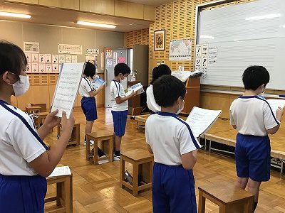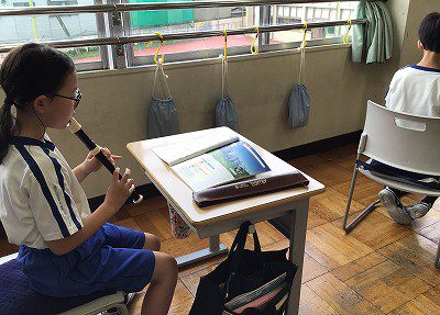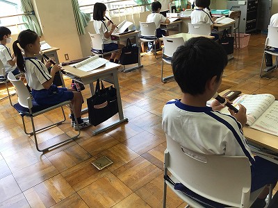 今学期から、学年の教室でリコーダーや鍵盤ハーモニカの学習を行う計画を立てました。各自の机の前で、マスクを外した学習に取り組む時間です。