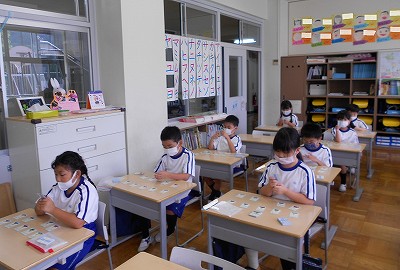1学期に学習したことを思い出して、歴史的仮名遣いに気をつけて読んでいます。 次の時間は、取り札を並べて「かるた遊び」をする予定です。 少しずつ暗唱にもチャレンジしながら、上の句を聞いただけで下の句が取れるように学習を進めます。