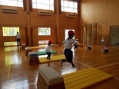 体育では、跳び箱からのジャンプをしています。2段からスタートして、今日は3段になりましたが、みんなジャンプを楽しんでいます。