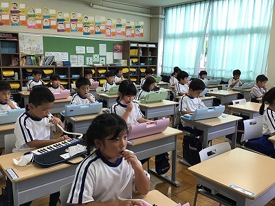 一番左端の低~い音を使って、“息だけでリズムが表現できる”という、鍵ハモの特長を1年生のみなさんに知らせました。「タン・タン・タンタンタン・」のリズムで音を出し、全員でピタッとフィニッシュができる学習を行いました。なかなか、そろわない時間が過ぎましたが、粘りに粘ってピタッ、シーン!と、見事なフィニッシュを迎えました。