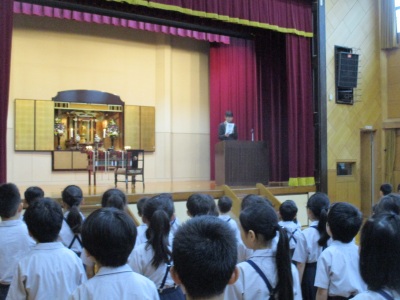 子ども達は荷物を提げて「私たちの勢至丸さま」にご挨拶。