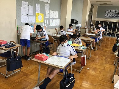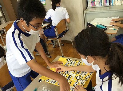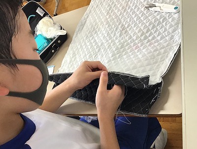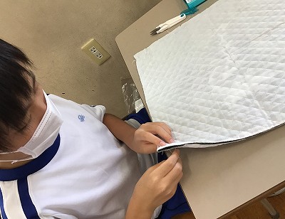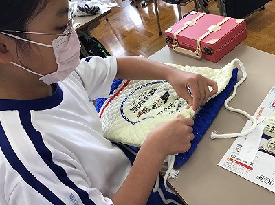 「ナップザック作り」に取り組んでいます。1学期からの続きなので、5年キッズは自分の進み具合を覚えているでしょうか???