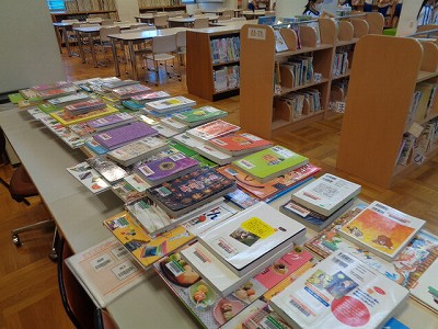 夏休み中に借りていた本を図書室で返却しました。返す本でカウンターが埋まりました。